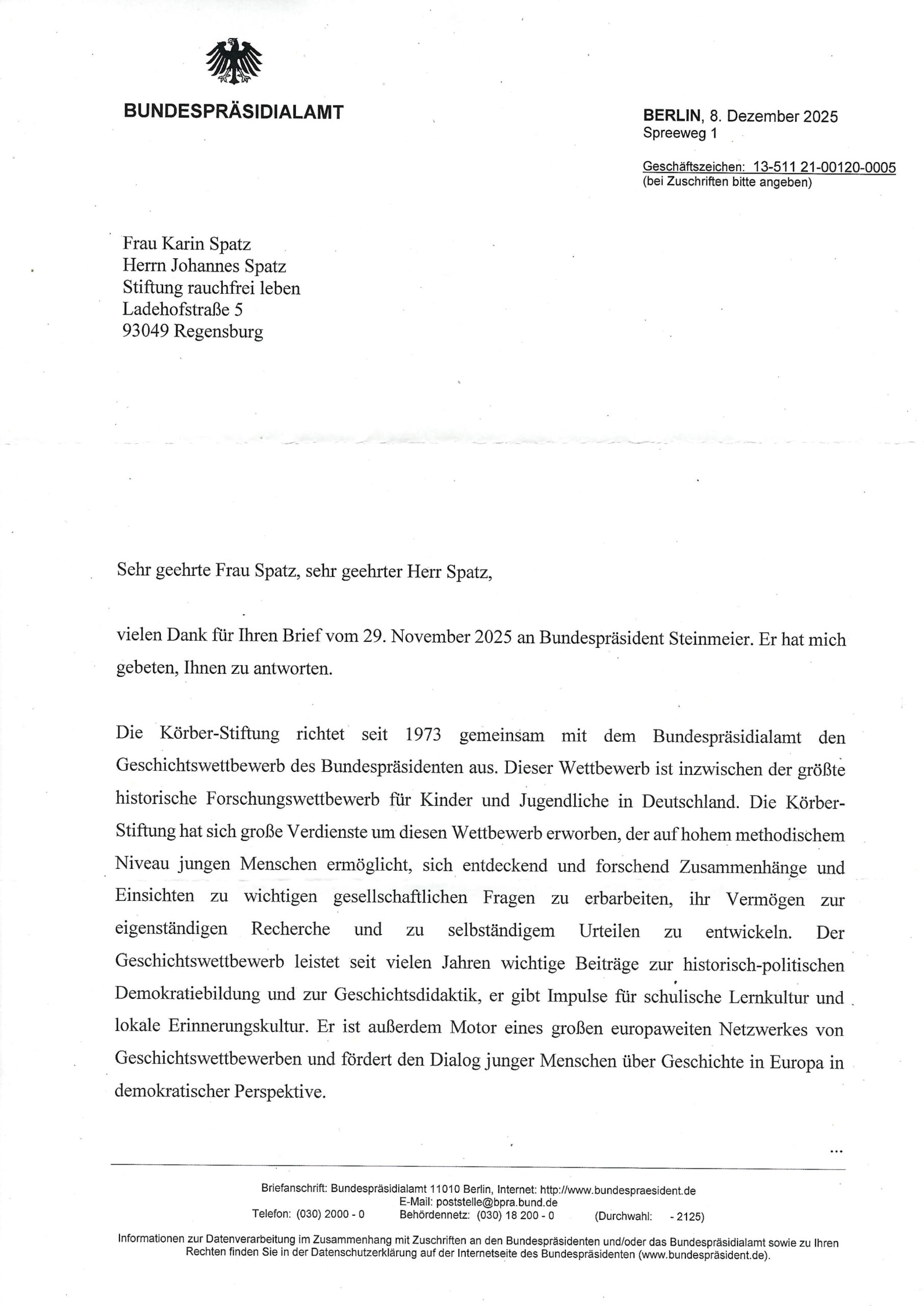 Näheres zum Geschichtswettbewerb des Bundespräsidenten gemeinsam mit der Tabakindustrie auf der Webseite der Stiftung rauchfrei leben in dem Beitrag vom 15. Januar 2026.