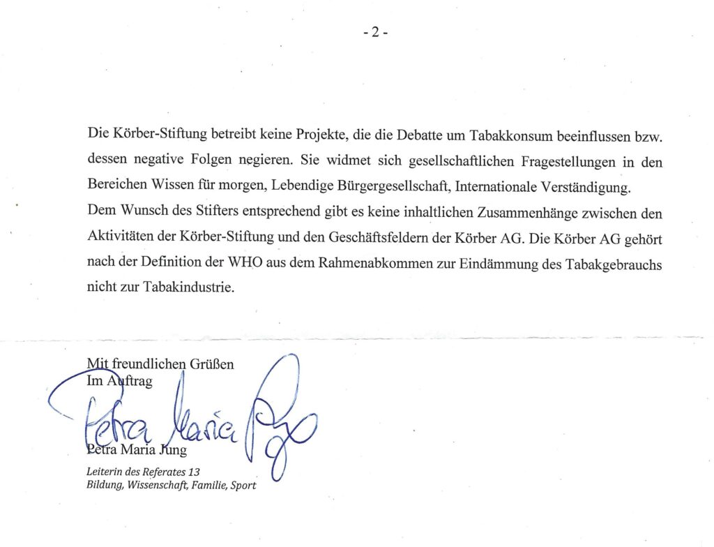 Die Zusammenarbeit des Bundespräsidenten mit der Tabakindustrie wertet die Tabakindustrie auf. Es geht um die Gesundheit und das Leben vieler Menschen. Wir fordern die vollständige Ächtung der Tabakindustrie. Der Bundespräsident muss seine Zusammenarbeit mit der Körber-Stiftung beenden.